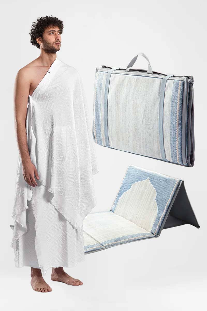 A complete Umrah set featuring a premium ihram and a padded backrest prayer mat for comfort during prayer, rest, and travel.