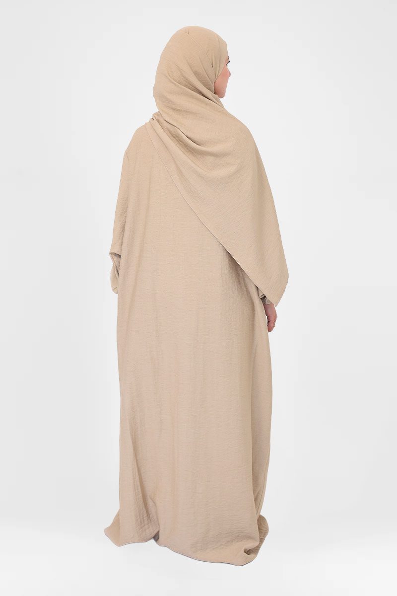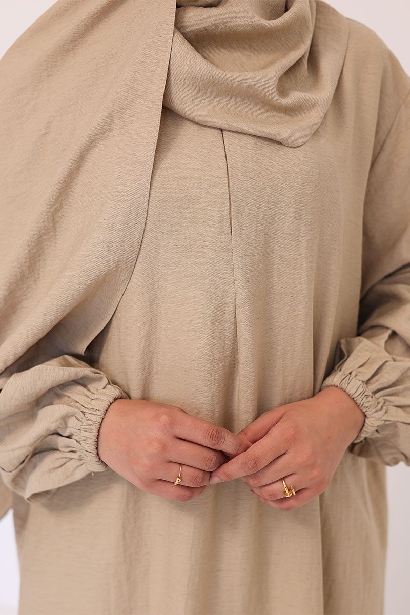 Calm, breathable linen-cotton prayer dress designed for softness, modesty, and ease in worship.