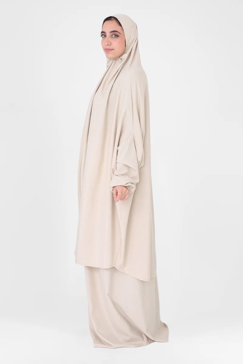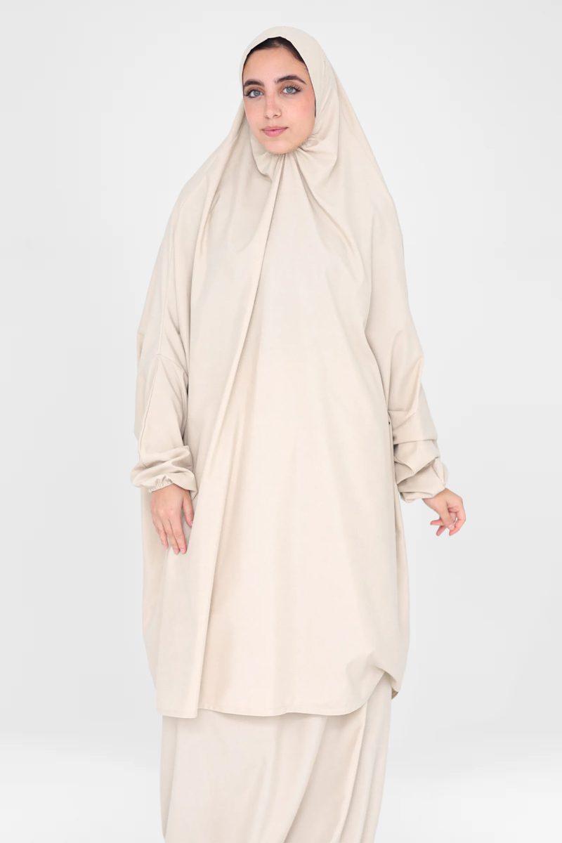 Arcadia two-piece prayer wear in a beautiful beige color. Designed for indoor and outdoor Salah, as well as Umrah, this set offers full coverage, comfort, and ease of movement.