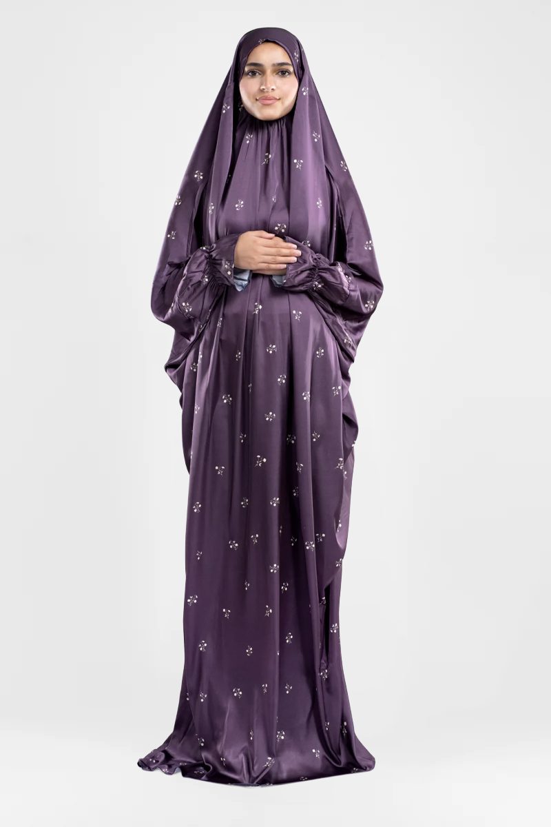 Elegant one-piece satin prayer wear designed for full coverage, effortless wear, and smooth comfort during Salah. Lightweight and flowing for ease of movement.