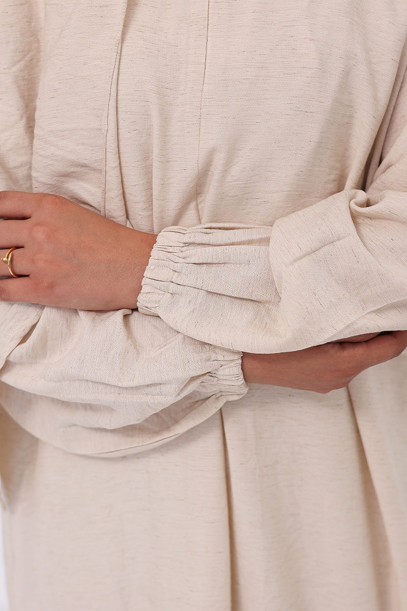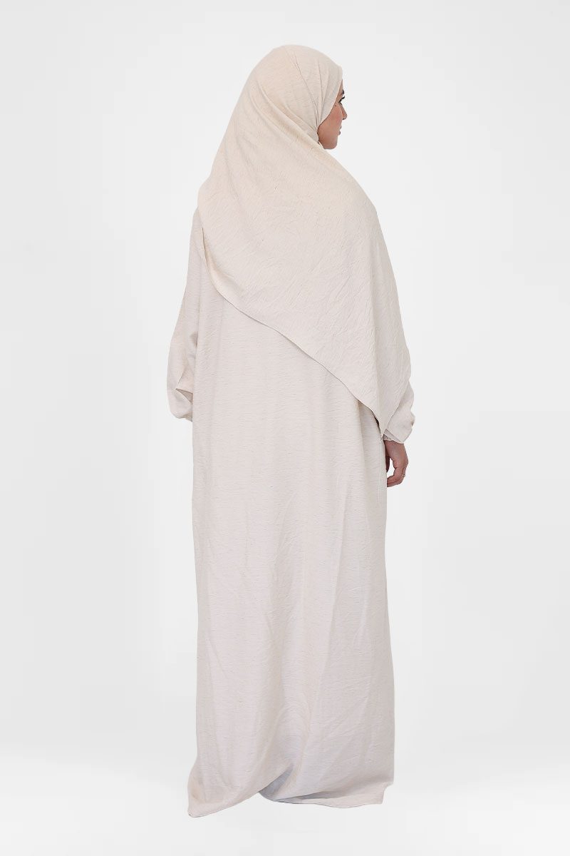 Calm, breathable linen-cotton prayer dress designed for softness, modesty, and ease in worship.