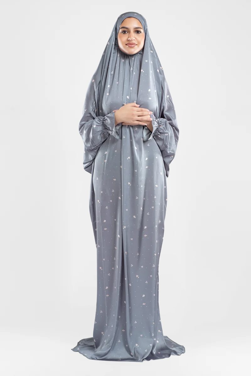 Elegant one-piece satin prayer wear designed for full coverage, effortless wear, and smooth comfort during Salah. Lightweight and flowing for ease of movement.